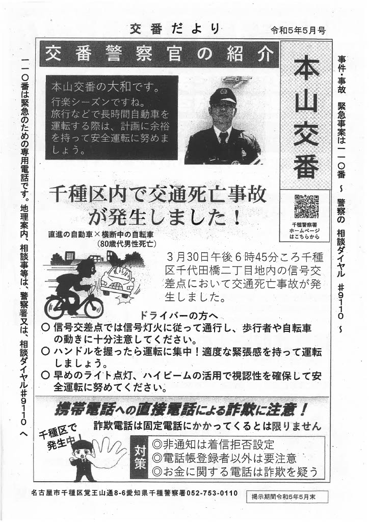 交番だより 令和5年5月 2023 8/13 防犯 2023年5月12日2023年8月13日 交番だより令和5年5月 1 ファイル 402.35 KB ダウンロード 防犯 ちくさけいさつ通信 令和5年4月 東明町町内会オフィシャルサイトのご案内 関連記事 交番だより 令和8年1月号 2026年1月10日 交番だより 令和7年11月号 2025年11月15日 セーフティーマイタウンちくさ 2025年11月15日 セーフティーマイタウン千種 令和7年9月 2025年9月11日 交番だより 令和7年9月 2025年9月11日 セーフティーマイタウン ちくさ 令和7年7月号 2025年7月11日 交番だより 令和7年7月号 2025年7月11日 交番だより 令和7年3月 2025年3月14日