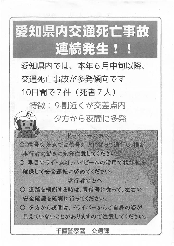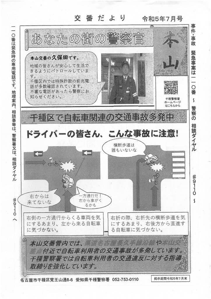 交番だより 令和5年7月 2023 8/13 防犯 2023年7月18日2023年8月13日 交番だより 令和5年7月 1 ファイル 472.07 KB ダウンロード 防犯 消防だより 令和5年7月 防犯パトロール参加依頼 令和5年 関連記事 交番だより 令和8年1月号 2026年1月10日 交番だより 令和7年11月号 2025年11月15日 セーフティーマイタウンちくさ 2025年11月15日 セーフティーマイタウン千種 令和7年9月 2025年9月11日 交番だより 令和7年9月 2025年9月11日 セーフティーマイタウン ちくさ 令和7年7月号 2025年7月11日 交番だより 令和7年7月号 2025年7月11日 交番だより 令和7年3月 2025年3月14日