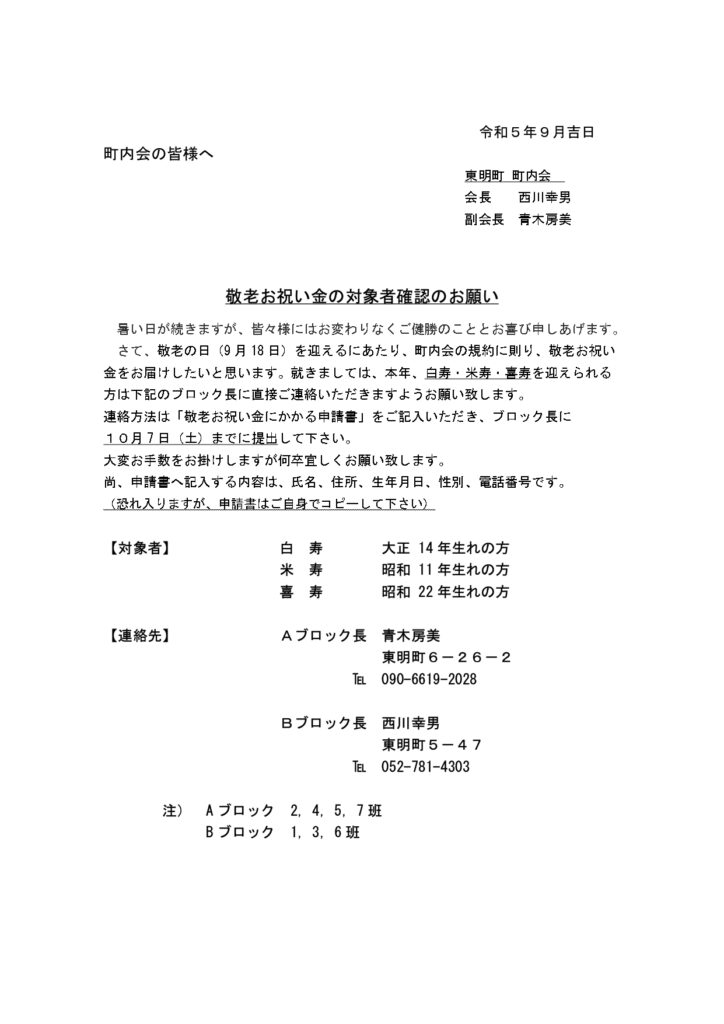 敬老お祝い金対象者確認のお願い 2023 9/15 お知らせ 2023年9月15日 敬老お祝い金対象者確認のお願い 1 ファイル 70.65 KB ダウンロード お知らせ 東山学区体育祭2023 交番だより 令和5年9月 関連記事 交番だより 令和8年1月号 2026年1月10日 名古屋市環境局からのお知らせ 2026年1月10日 令和7年度 年末年始ゴミ収集日 2025年12月13日 交通事故防止のPOINT 令和7年12月 2025年12月13日 交通安全 生活安全 2025年年末号 2025年11月15日 交通事故防止のPOINT 2025年10月9日 交通事故防止のポイント 2025年8月10日 安否確認プレートの見本 2025年8月10日