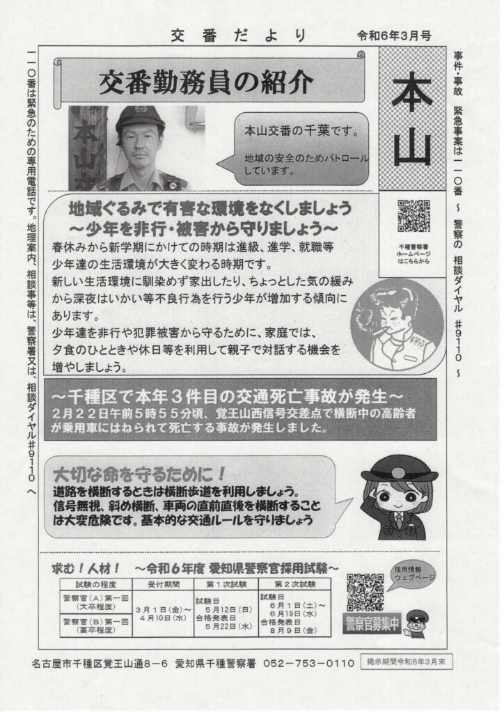 交番だより 令和6年3月 2024 3/16 防犯 2024年3月16日 交番だより 令和6年3月 1 ファイル 809.99 KB ダウンロード 防犯 第26回 コミセン祭りのお知らせ 特殊詐欺対策について 関連記事 セーフティーマイタウンちくさ 令和8年3月号 2026年3月13日 交番だより 令和8年3月号 2026年3月13日 交番だより 令和8年1月号 2026年1月10日 交番だより 令和7年11月号 2025年11月15日 セーフティーマイタウンちくさ 2025年11月15日 セーフティーマイタウン千種 令和7年9月 2025年9月11日 交番だより 令和7年9月 2025年9月11日 セーフティーマイタウン ちくさ 令和7年7月号 2025年7月11日