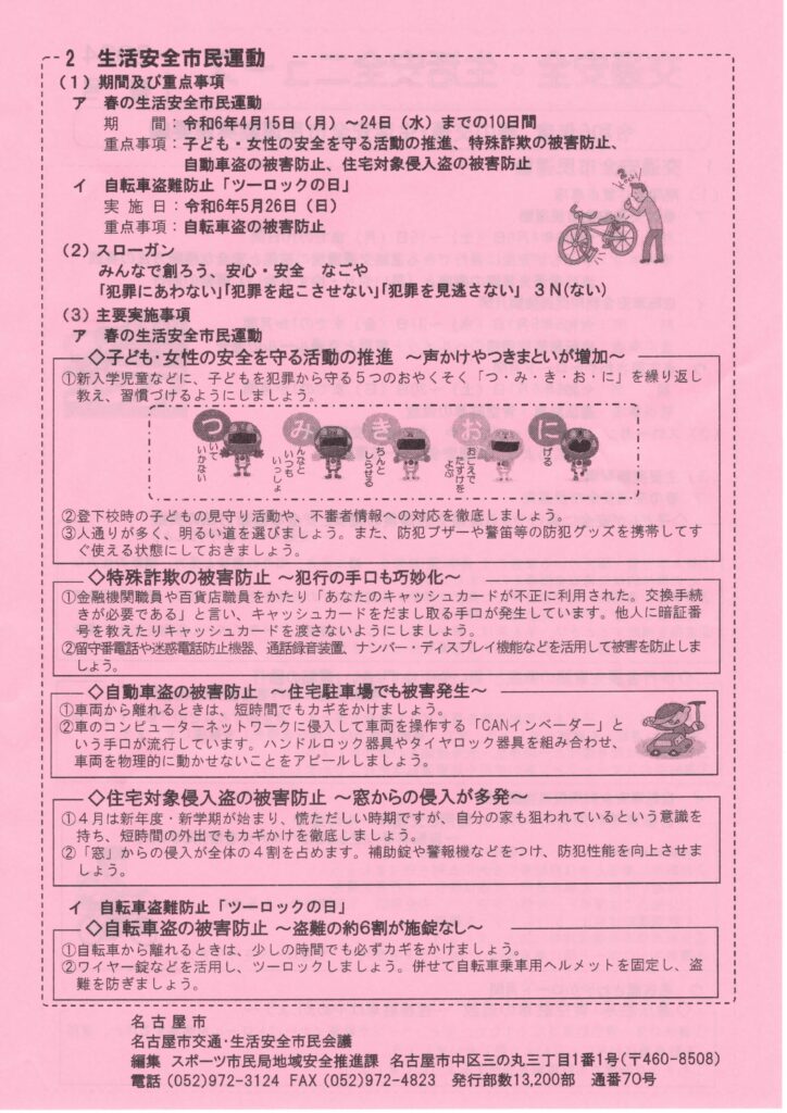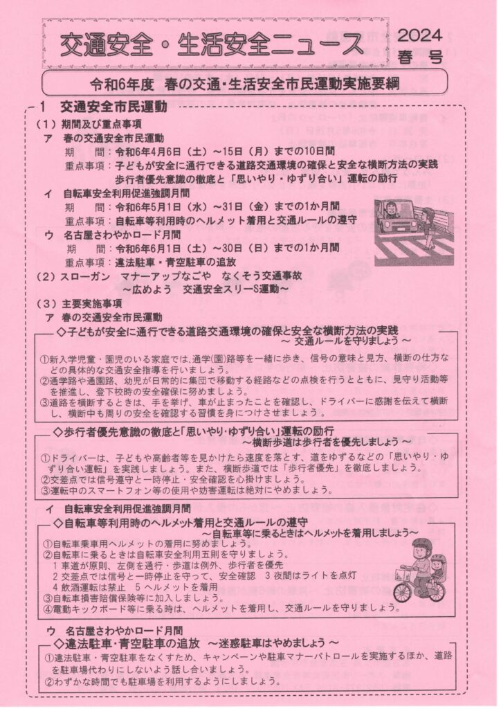 交通安全・生活安全NEWS-2024年春号 2024 3/16 お知らせ 2024年3月16日 交通安全・生活安全NEWS-2024年春号 1 ファイル 1.36 MB ダウンロード お知らせ 安否確認活用法 災害対策委員会 NEWS-vol.9 関連記事 交番だより 令和8年1月号 2026年1月10日 名古屋市環境局からのお知らせ 2026年1月10日 令和7年度 年末年始ゴミ収集日 2025年12月13日 交通事故防止のPOINT 令和7年12月 2025年12月13日 交通安全 生活安全 2025年年末号 2025年11月15日 交通事故防止のPOINT 2025年10月9日 交通事故防止のポイント 2025年8月10日 安否確認プレートの見本 2025年8月10日