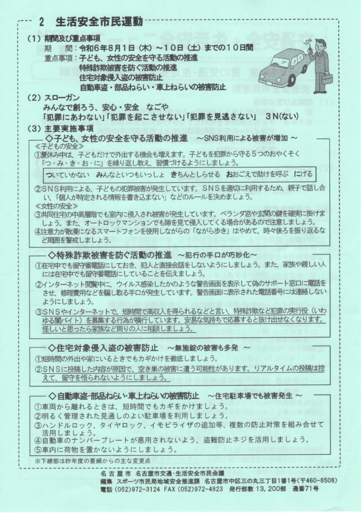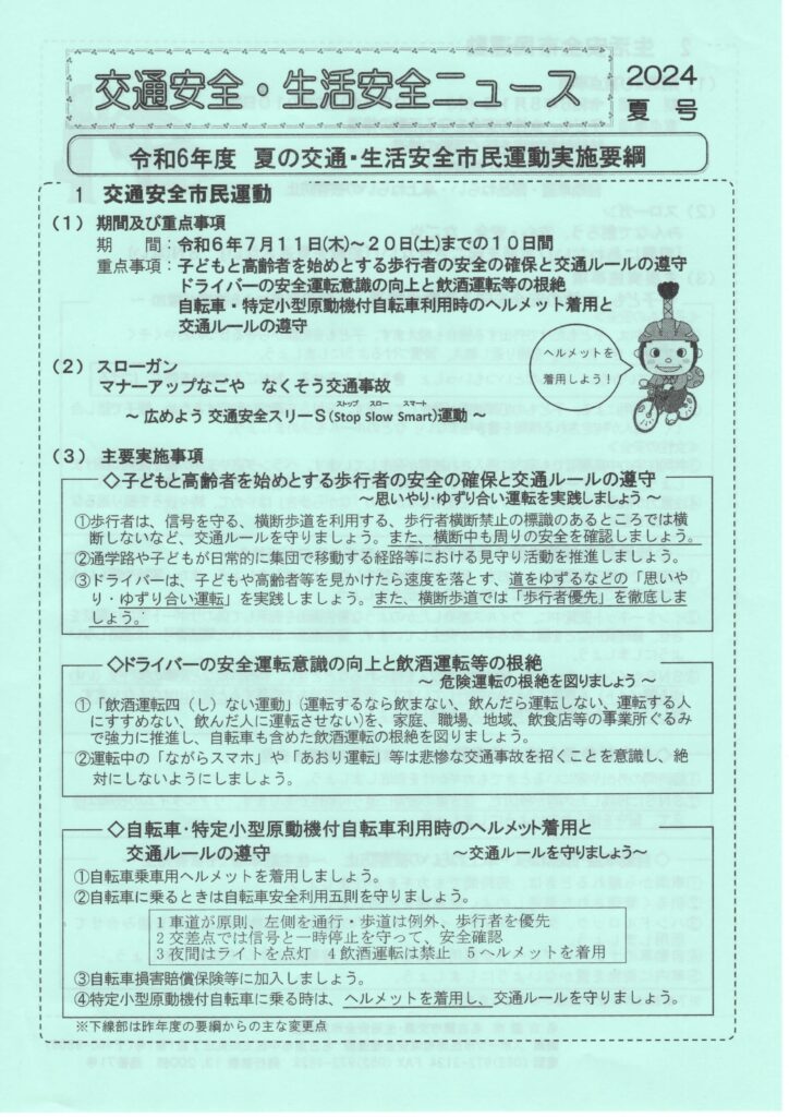 交通安全・生活安全 NEWS-2024年 夏号 2024 6/15 お知らせ 2024年6月15日 交通安全・生活安全NEWS-2024年夏号 1 ファイル 1.36 MB ダウンロード お知らせ 名古屋市交通局 お知らせ 地域防災NEWS 令和6年6月 関連記事 交番だより 令和8年1月号 2026年1月10日 名古屋市環境局からのお知らせ 2026年1月10日 令和7年度 年末年始ゴミ収集日 2025年12月13日 交通事故防止のPOINT 令和7年12月 2025年12月13日 交通安全 生活安全 2025年年末号 2025年11月15日 交通事故防止のPOINT 2025年10月9日 交通事故防止のポイント 2025年8月10日 安否確認プレートの見本 2025年8月10日