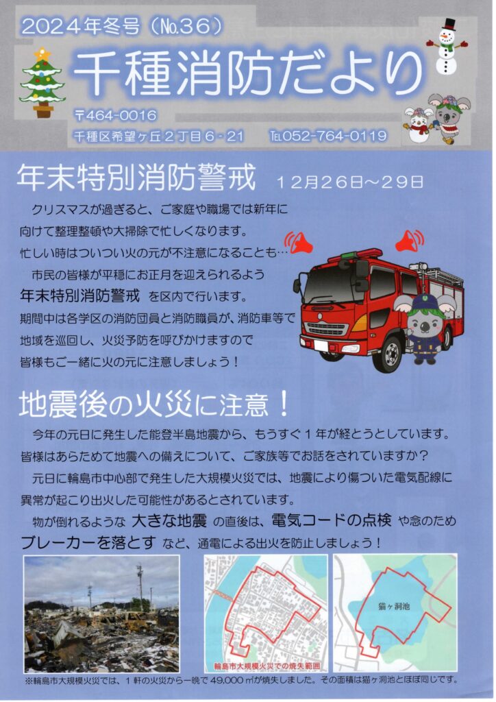 千種消防だより 2024年冬号 2024 12/13 千種区 消防 2024年12月13日 千種消防だより 2024年冬号 1 ファイル 1.53 MB ダウンロード 千種区 消防 地域防災NEWS 令和6年12月号 交番だより 令和7年1月号 関連記事 春の火災予防運動の実施について(お知らせ) 2026年2月12日 名古屋市消防局(お知らせ) 2026年2月12日 千種消防だより 2025年12月冬号 2025年12月13日 蛍光灯からLEDへ(注意) 2025年12月13日 セーフティーマイタウンちくさ 2025年11月15日 火災予防チェック 2025年10月9日 千種消防だより 2025年秋号 2025年10月9日 セーフティーマイタウン千種 令和7年9月 2025年9月11日