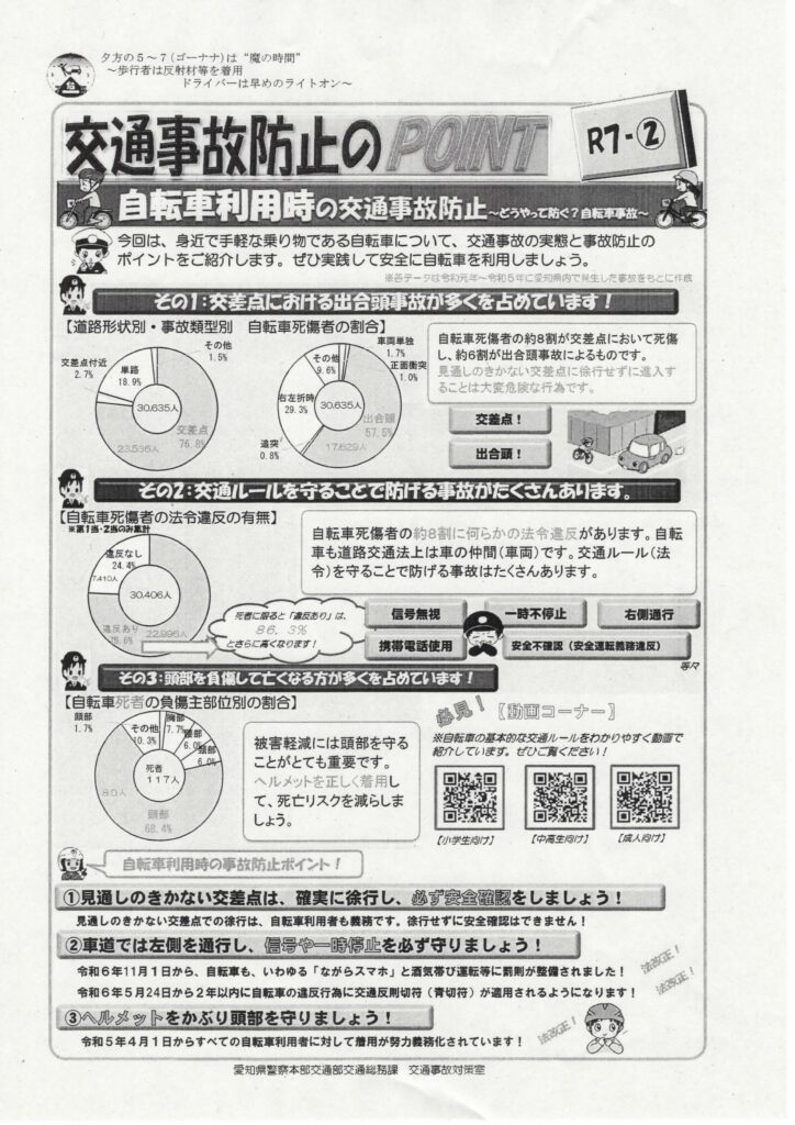 交通事故防止のポイント 令和7年2月 2025 2/14 お知らせ 2025年2月14日 交通事故防止のポイント 令和7年2月 1 ファイル 876.99 KB ダウンロード お知らせ 交番だより 令和7年1月号 春の火災予防活動の実施について 関連記事 地域防災 NEWS 令和8年3月 2026年3月13日 セーフティーマイタウンちくさ 令和8年3月号 2026年3月13日 交番だより 令和8年3月号 2026年3月13日 令和6年能登半島地震から学ぶ 2026年2月12日 交番だより 令和8年1月号 2026年1月10日 名古屋市環境局からのお知らせ 2026年1月10日 令和7年度 年末年始ゴミ収集日 2025年12月13日 交通事故防止のPOINT 令和7年12月 2025年12月13日