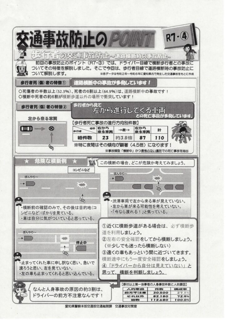 交通事故防止ポイント 2025 4/10 お知らせ 2025年4月10日 交通事故防止ポイント 1 ファイル 765.03 KB ダウンロード お知らせ 交番だより 令和7年3月 愛知名古屋2026大会ボランティア募集 関連記事 地域防災 NEWS 令和8年3月 2026年3月13日 セーフティーマイタウンちくさ 令和8年3月号 2026年3月13日 交番だより 令和8年3月号 2026年3月13日 令和6年能登半島地震から学ぶ 2026年2月12日 交番だより 令和8年1月号 2026年1月10日 名古屋市環境局からのお知らせ 2026年1月10日 令和7年度 年末年始ゴミ収集日 2025年12月13日 交通事故防止のPOINT 令和7年12月 2025年12月13日