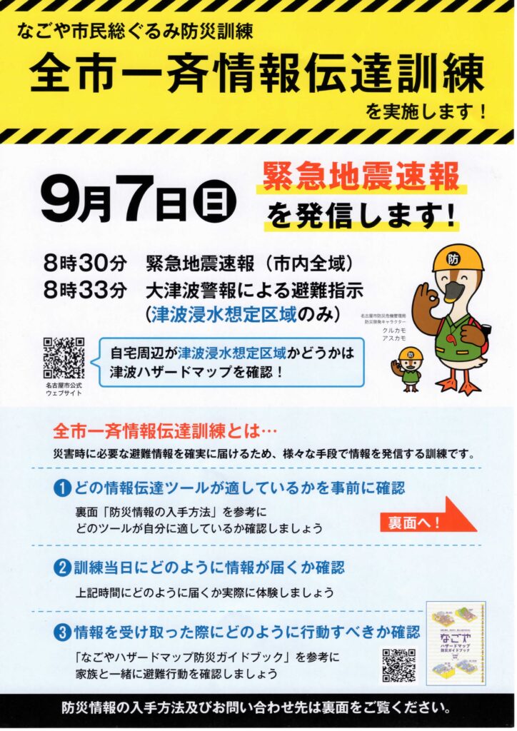 全市一斉情報伝達訓練 2025 7/11 お知らせ 2025年7月11日 全市一斉情報伝達訓練 1 ファイル 1.37 MB ダウンロード お知らせ セーフティーマイタウン ちくさ 令和7年7月号 安否確認プレートの見本 関連記事 交番だより 令和8年1月号 2026年1月10日 名古屋市環境局からのお知らせ 2026年1月10日 令和7年度 年末年始ゴミ収集日 2025年12月13日 交通事故防止のPOINT 令和7年12月 2025年12月13日 交通安全 生活安全 2025年年末号 2025年11月15日 交通事故防止のPOINT 2025年10月9日 交通事故防止のポイント 2025年8月10日 安否確認プレートの見本 2025年8月10日