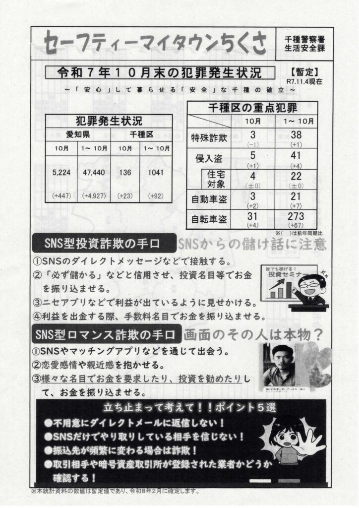 セーフティーマイタウンちくさ 2025 12/13 千種区 防犯 2025年11月15日2025年12月13日 セーフティーマイタウンちくさ 1 ファイル 1.28 MB ダウンロード 千種区 防犯 火災予防チェック 交番だより 令和7年11月号 関連記事 交番だより 令和8年1月号 2026年1月10日 交番だより 令和7年11月号 2025年11月15日 セーフティーマイタウン千種 令和7年9月 2025年9月11日 交番だより 令和7年9月 2025年9月11日 セーフティーマイタウン ちくさ 令和7年7月号 2025年7月11日 交番だより 令和7年7月号 2025年7月11日 セーフティーマイタウン 千種警察交通課 2025年6月13日 STOP 放火火災 千種消防署 2025年5月9日