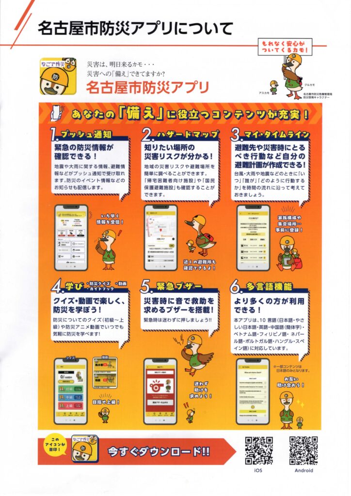 名古屋市防災アプリ 2025 12/13 防災 2025年12月13日 名古屋市防災アプリ 1 ファイル 729.74 KB ダウンロード 防災 蛍光灯からLEDへ(注意) 千種消防だより 2025年12月冬号 関連記事 地域防災 NEWS 令和8年3月 2026年3月13日 令和6年能登半島地震から学ぶ 2026年2月12日 発災直後の活動 2025年9月11日 地域防災NEWS 令和7年6月 2025年6月13日 備えよう 災害に! 2025年4月10日 地域防災NEWS 令和7年3月 2025年3月14日 地域防災NEWS 令和6年12月号 2024年12月13日 令和6年 防災訓練 2024年10月23日
